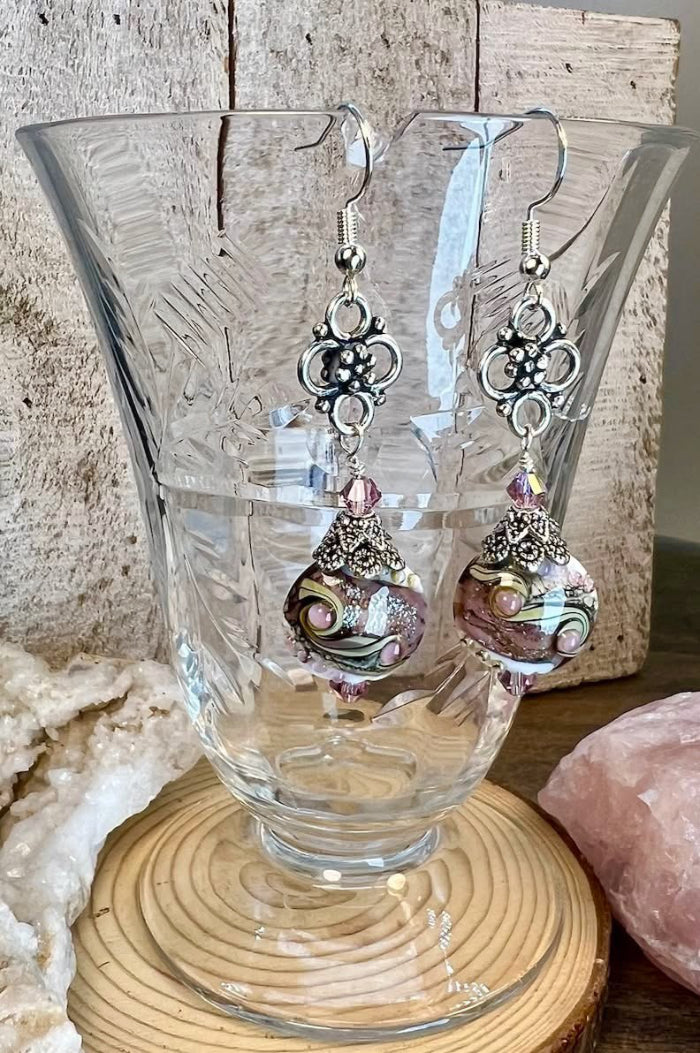 Pink, cream, taupe and little gold flecks reside in this glass earring with Sterling Silver. So pretty and if you look closely at the glass, you will see just how pretty they are. Vintage Pink Swarovski Crystals reside on top of the bead caps in Sterling. A long earring.