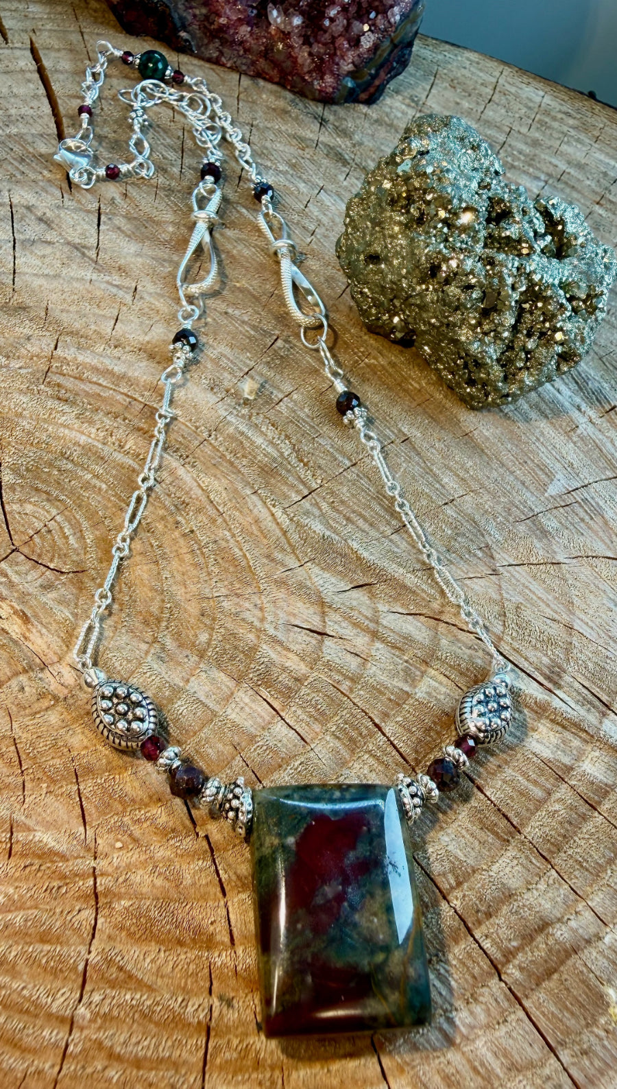 Bloodstone is so rich and pretty in its forest green color with red running throughout the stone. It's a Chalcedony Quartz. It promotes strength, vitality and courage. This bloodstone is surrounded by Garnets and lots of Sterling Silver. Garnets are wire-wrapped throughout the chain. I added a Sterling Silver lobster clasp to keep it on your neck! 5 different Sterling Silver chains were used in this necklace.