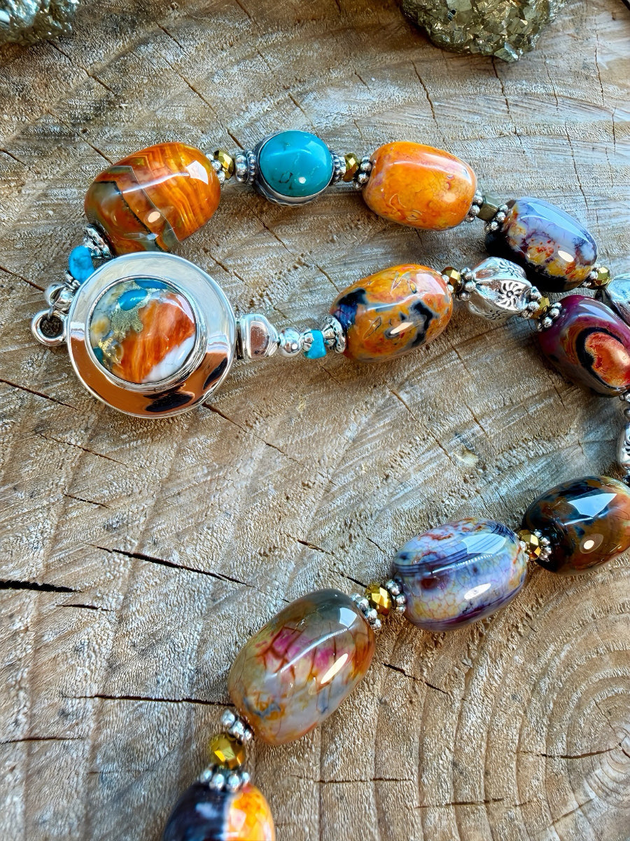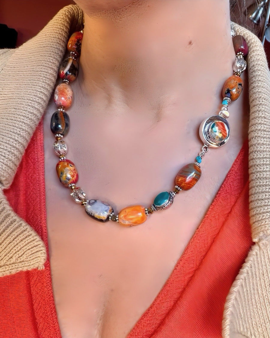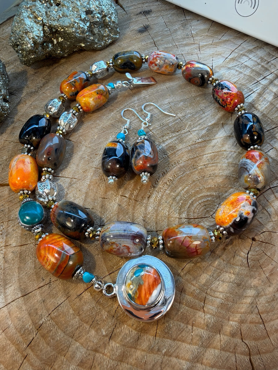 Say YES to fire. Autumn is here! Tibetan Agate along with Turquoise and lots of Sterling Silver make up this statement piece of a necklace. The clasp is a catch and lock clasp that will stay put and is made of Turquoise and Pyrite. Turquoise comes in orange and white along with so many other colors. I am in love with the Pyrite that runs throughout the stone in the clasp. Sterling Silver beads are throughout the necklace and one lone Turquoise and Sterling bead is near the clasp. It's gorgeous. Vibrant colors with a touch of black and grey are in the stones. Every stone has its own little pattern and story. It's $268 and matching earrings are sold separately.