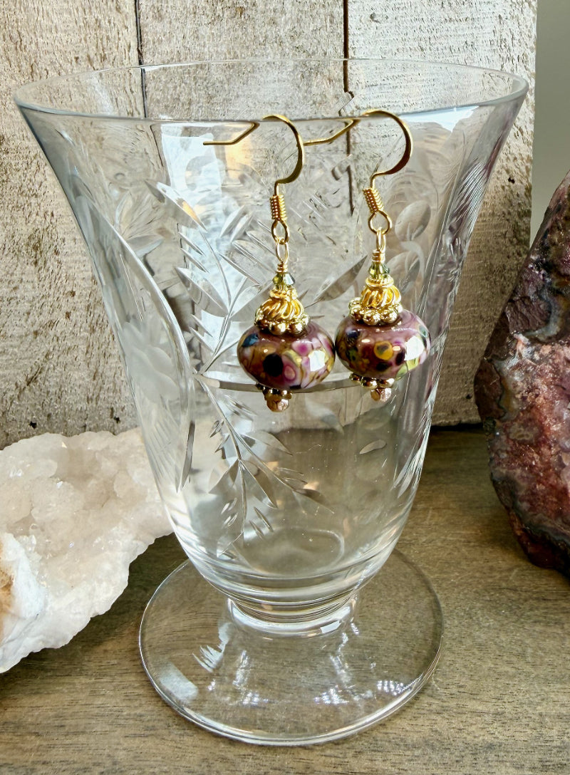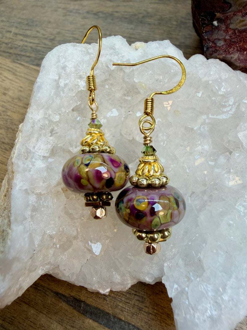 Lampwork Glass. There is nothing like it and especially when it is handmade. These handmade lampwork glass earrings in hues or purple and green remind me of a spring into summer garden. Not long, more on the shorter size but full of colors and swirls so darn pretty. Paired with Vermeil, these are rich and lovely.