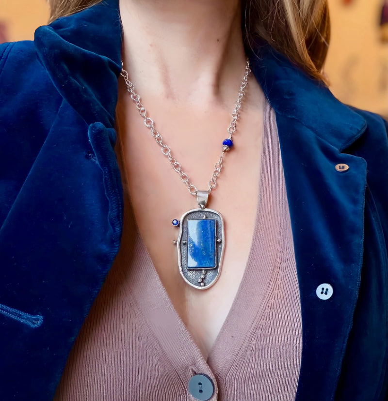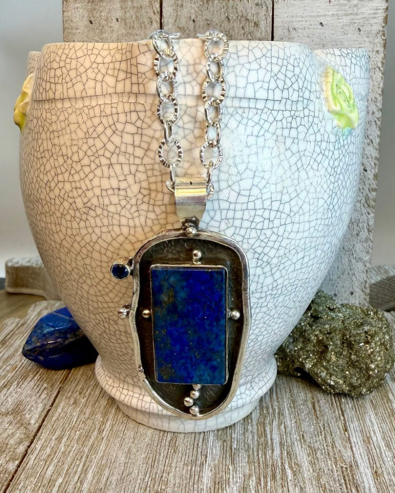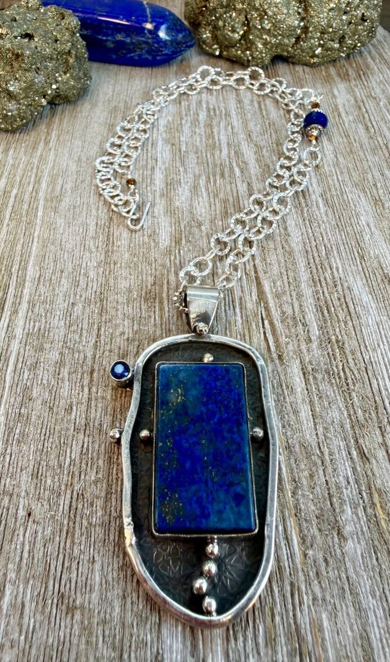 Lapis never disappoints. With its Pyrite flecks and its true beauty, it will forever be a winner. To keeping it simple with this one. Lapis is set in Sterling Silver with a Blue Sapphire to the left. So pretty, it measures 19.5 inches in length and can be shortened with the hook clasp in the back. Want it longer? No problem, just ask. I put two photos in here of it on me with one having light shine directly on the stone and the other one without the light directly hitting it. It comes with a Sterling Silver chain with one lone Lapis bead surrounded by Sterling.