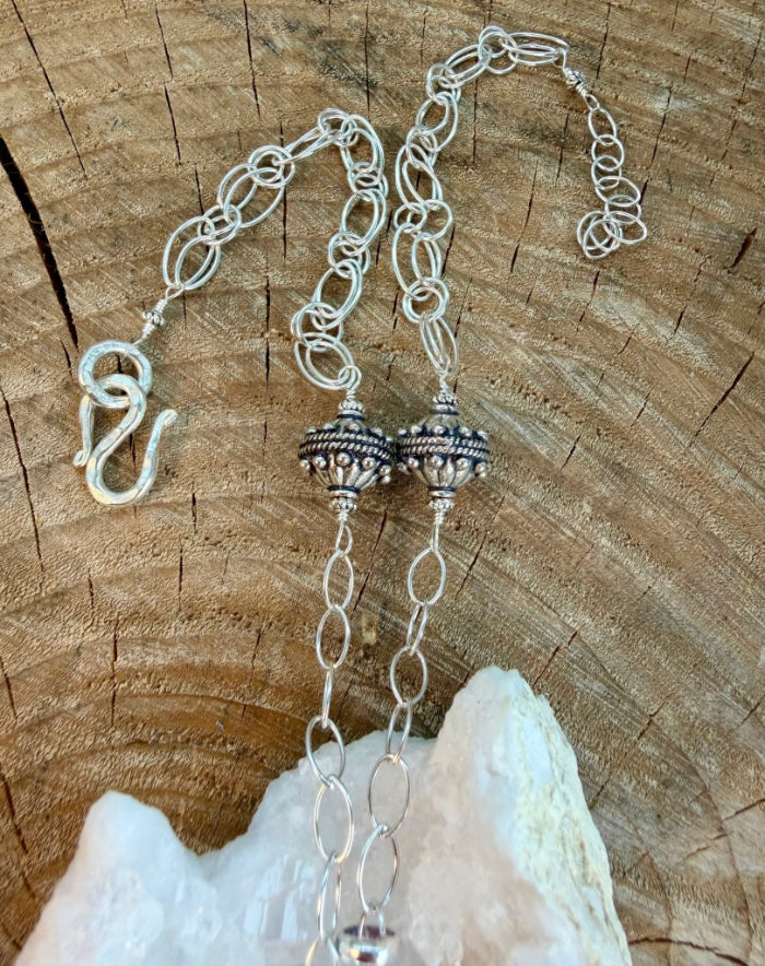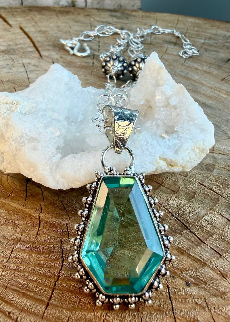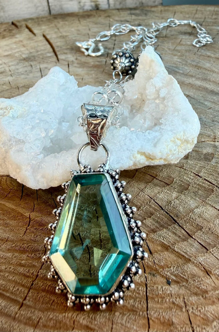 For March born babies or those who just so happen to love Aquamarine. Aquamarine is known for promoting good health, youth and hope. This Aquamarine stone is set in Sterling Silver with two different Sterling Silver chains. So pretty and you can adjust the length with its S shaped clasp.