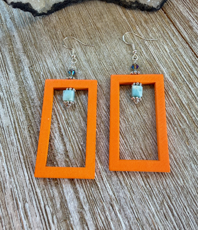 Orange. One of the favorite colors of mine. Vibrant, modern and so fun and lightweight, these wood earrings with Larimar are so pretty and big. They are perfect for someone who likes to step out of the box. There is no box! With Sterling accents and wires, these are a fun spring into summer earring.