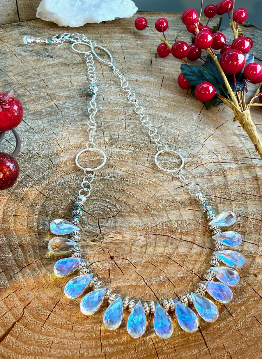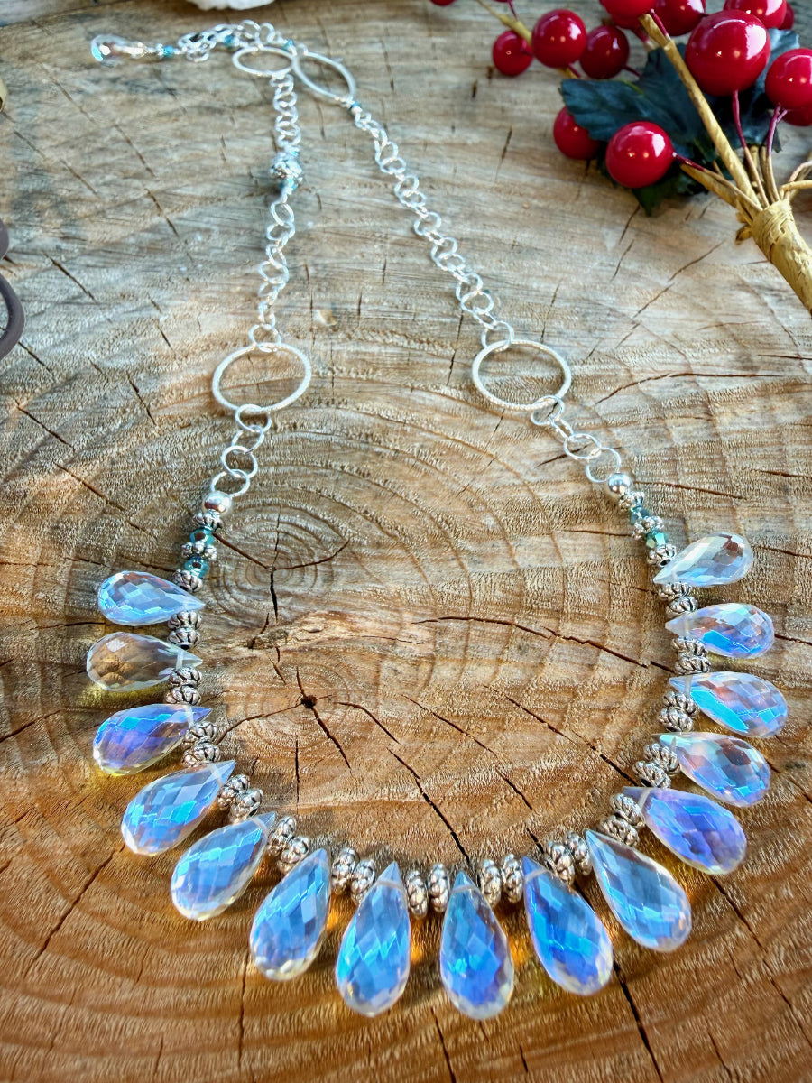 Moonstone is a gift. It's so pretty and it shines like a rainbow of gorgeous iridescent color and fabulousness. This multi faceted Moonstone is so pretty and paired up with Sterling Silver, it's just stunning. It has one lone Sterling Silver bead to the left and a fun Sterling chain with an S clasp where you can adjust the length to be shorter if you like. One Moonstone dangle drops down in the back. The first photo is a close up of the Moonstone, the 3rd photo shows the actual size of the necklace.