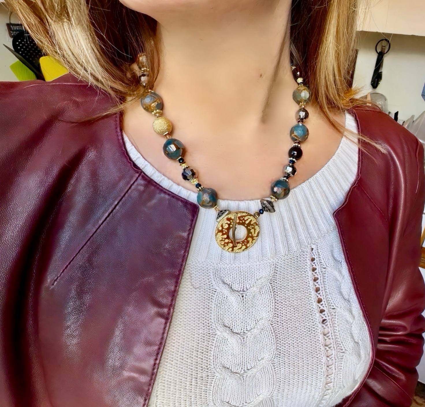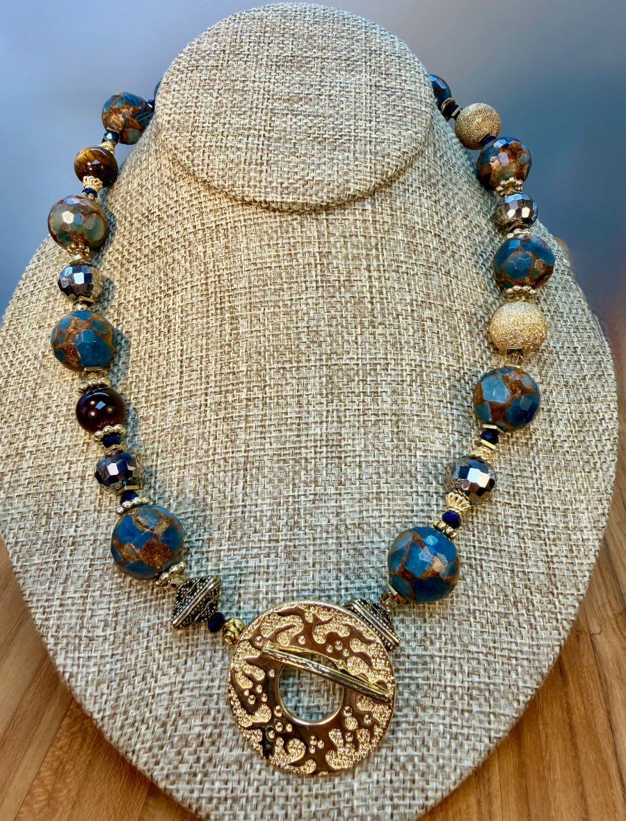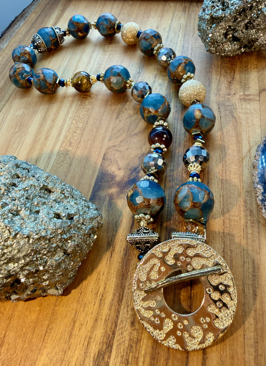 Golden Quartz never looked so good. Originally, I made a necklace with these stones years ago with Sterling Silver. I was recently looking at that very necklace and thought, that would look so much better with gold, so here we are. Golden Quartz, Vermeil, Pyrite, Cat's Eye and Bronze make up this gorgeous necklace with Swarovski Crystals in between each stone. Swarovski Crystals are no longer made for beading so these crystals are considered rare and are worth more. it's a gorgeous necklace from front to back. It measures 20 inches in length. You can wear the toggle in the front, to the side or in the back.