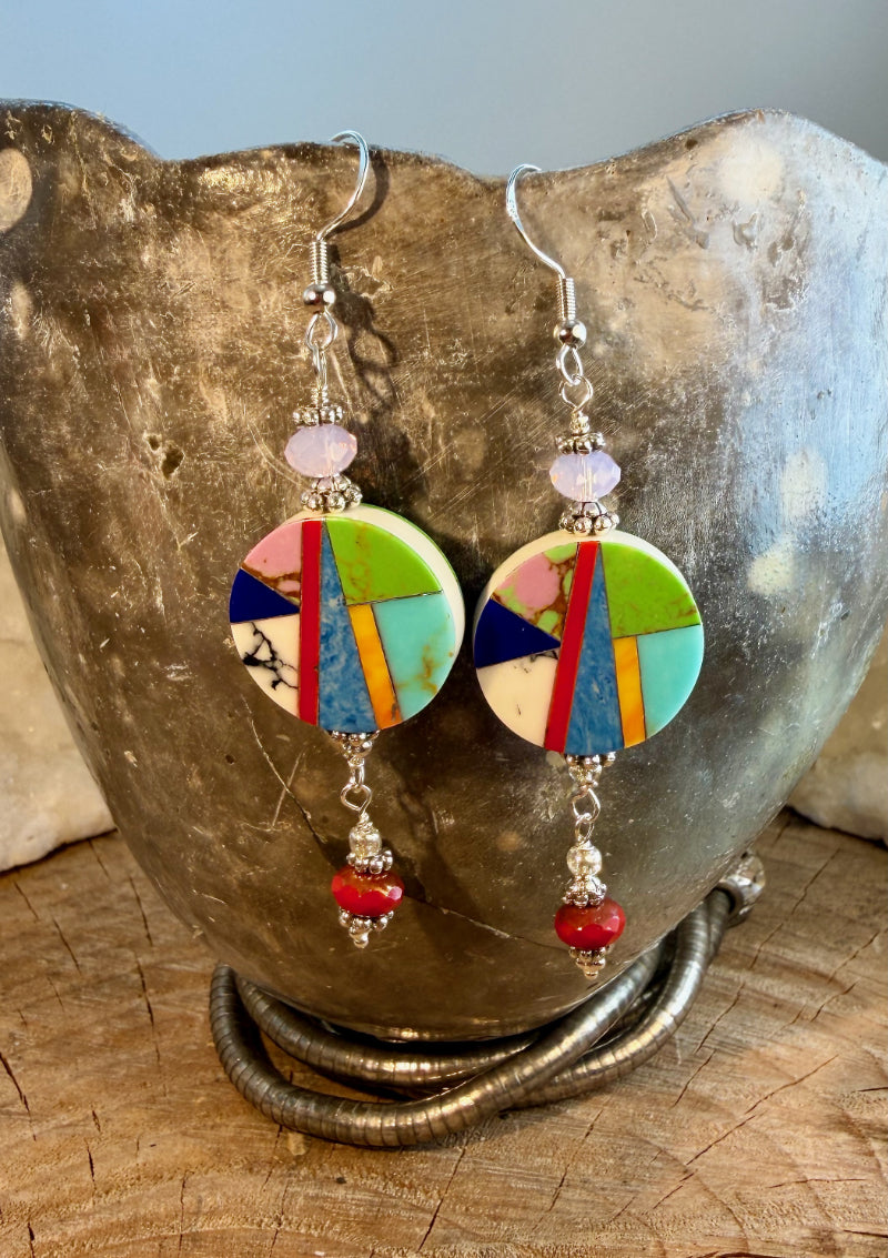 So many different shells and stones in these earrings. You've got Coral, Turquoise, Conch Shell, Lapis, Mother of Pearl in the bead, along with, Sterling Silver, Swarovski Crystals and Red Czech Glass. Long and lightweight and can go with so many different outfits.