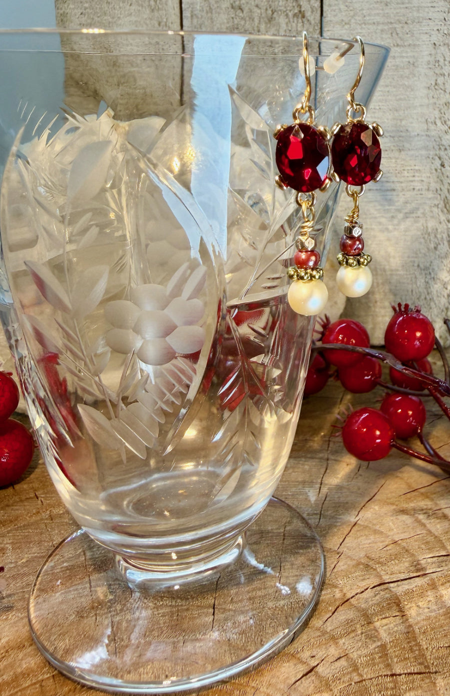 Red Crystals and faux Pearls with Vermeil. Simple, elegant and not long. Super lightweight to boot. For those who love Garnets or Rubies. These deep red Crystals are a cross between those two stones.